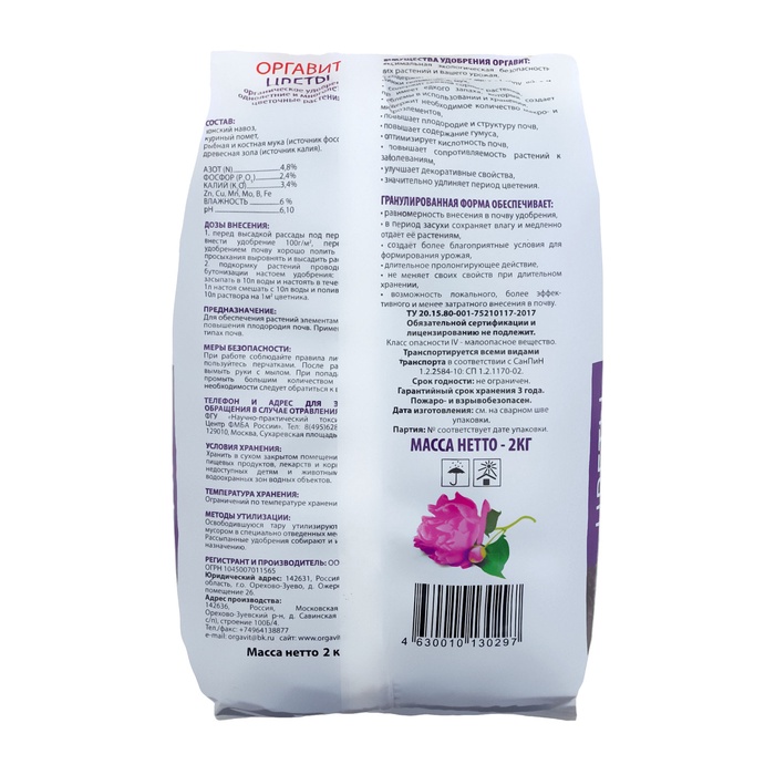 Удобрение гранулированное органическое Оргавит Цветы, 2 кг — Характеристики