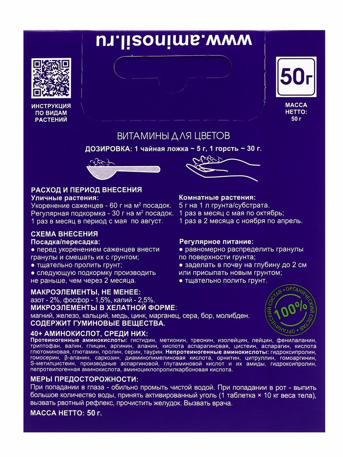 Привнесите яркие краски в цветочный мир! Пудра для цветов на основе аминокислот, 50 г — идеальное решение для вашего цветника. Это универсальный помощник, поддерживающий растение на всех этапах роста.