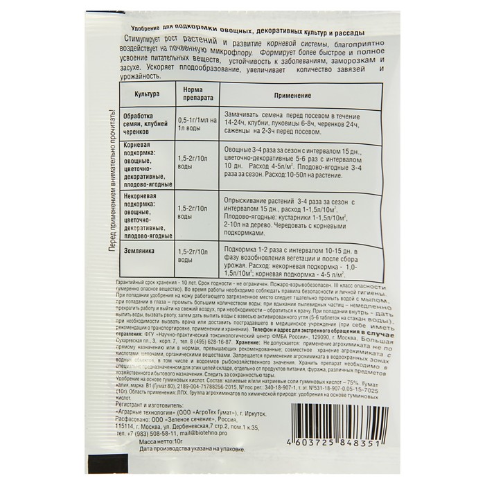 Удобрение "Гумат Калия" сухой, 10 г — Характеристики