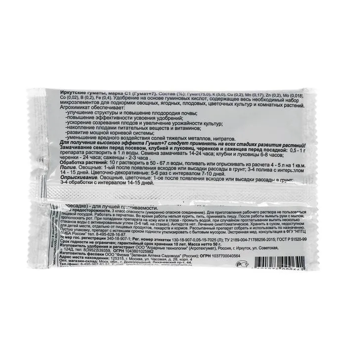 Удобрение Гумат+7 концентрат 50 г — Характеристики