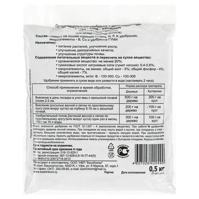 Состав: компост на основе куриного помёта, органика (не менее 15 %); общий азот (N) — 4 %, общий фосфор (P₂O₅) — 7 %; общий калий (K₂O) — 7 %; гуматы Na (0,4‒0,6 %); B (100‒300 мг/кг); Cu (100‒300 мг/кг).