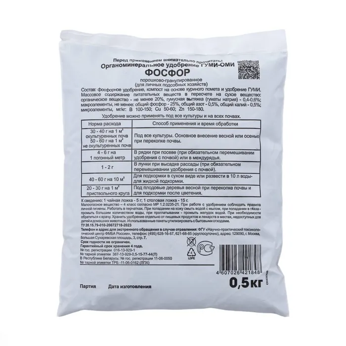 Состав: органика (не менее 10 %); общий азот (N) — 0,5 %, общий фосфор (P₂O₅) — 25 %; общий калий (K₂O) — 0,5 %; гуматы Na (0,4‒0,6 %); B (100‒150 мг/кг); Cu (50‒60 мг/кг).