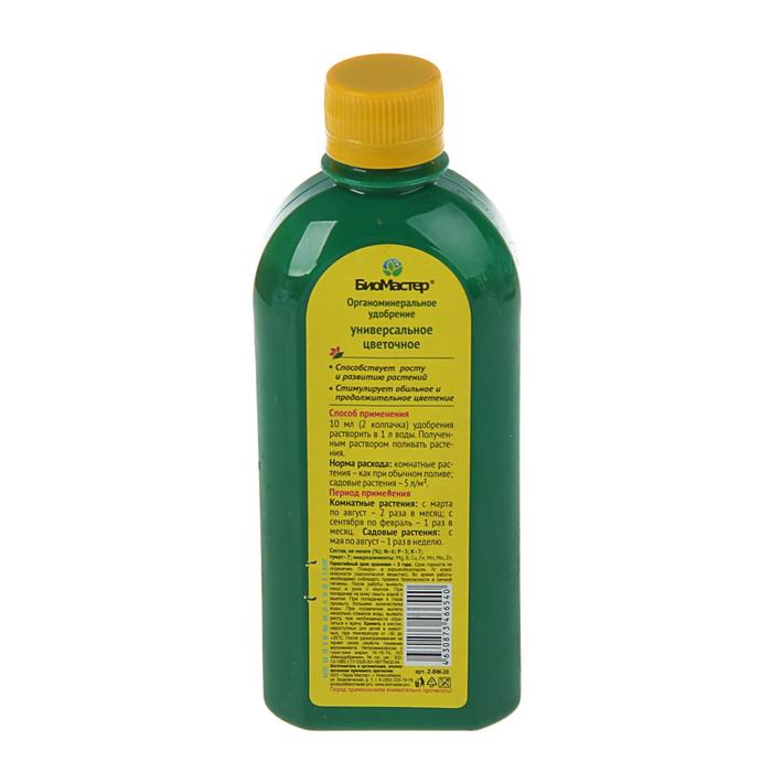 Удобрение комплексное "БиоМастер" универсальное для всех видов цветов, 0,35 л Подкормка, содержащая гумат калия, натрия, аммония, и ряд минеральных элементов, необходимых растениям в стартовый период жизни. При применении «Био Мастера» для рассады развивается мощная корневая система, ускоряется обмен веществ, увеличивается зеленая масса и повышается иммунитет растений к заболеваниям. Саженцы, при выращивании которых используется «Био Мастер», лучше приживаются и не испытывают меньший шок при пересадке. Активная органика — это уникальный комплекс биологически активных веществ и стимуляторов роста, оказывающих комплексное воздействие на почву, улучшая ее физические, химические, биологические и протекторные свойства.