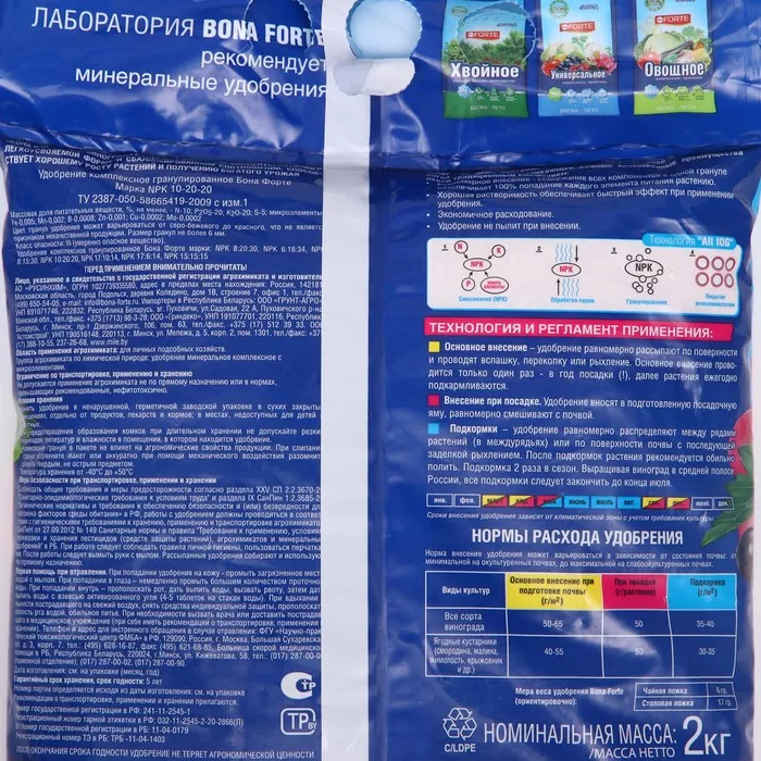 Удобрение содержит основные элементы питания в легкоусвояемой форме и сбалансированном соотношении, способствует хорошему росту растений и получению высокого урожая.