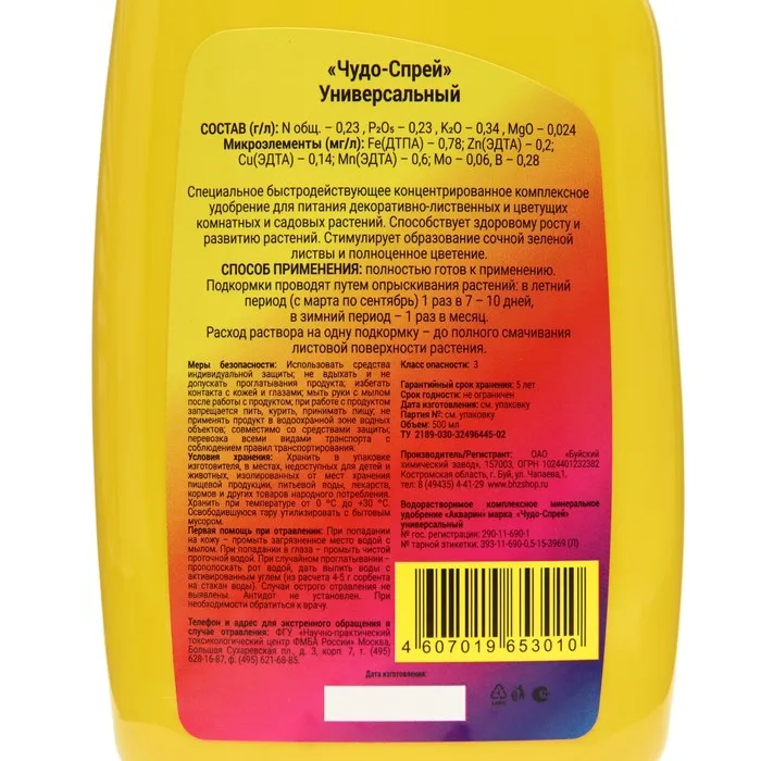 Удобрение комплексное "Буйские удобрения", жидкое, "Чудо спрей", универсальное, 0,5 л — Характеристики