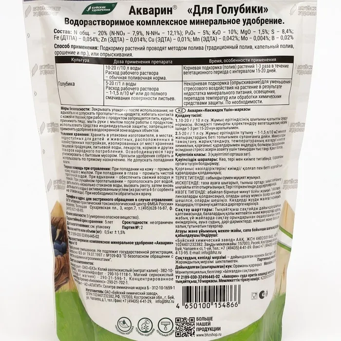 Акварин для голубики - водорастворимое удобрение, в состав которого входит азот, фосфор, калий, магний, сера и микроэлементы – железо, цинк, марганец, медь в хелатной форме, а бор и молибден – в минеральной. Благодаря кислой реакции (рН) удобрения, оно легко растворяется в холодной воде и более эффективно усваивается корневой системой или листовой поверхностью растений.