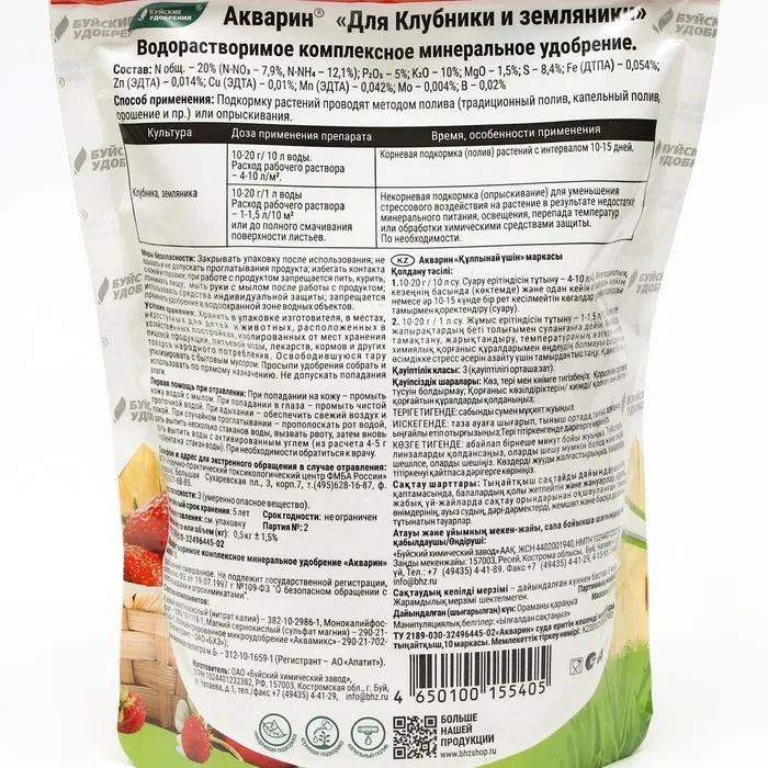 Акварин для клубники и земляники - водорастворимое удобрение, в состав которого входит азот, фосфор, калий, магний, сера и микроэлементы – железо, цинк, марганец, медь в хелатной форме, а бор и молибден – в минеральной. Благодаря кислой реакции (рН) удобрения, оно легко растворяется в холодной воде и более эффективно усваивается корневой системой или листовой поверхностью растений.