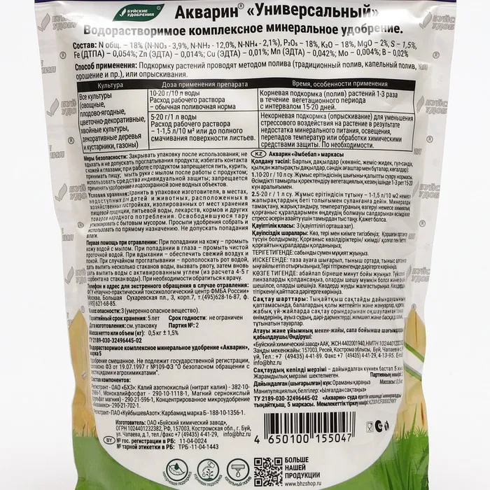 Подкормки проводят раствором удобрения или рано утром, или вечером, или в пасмурную погоду. Акварин можно использовать как самостоятельно, так и совместно со средствами защиты растений.