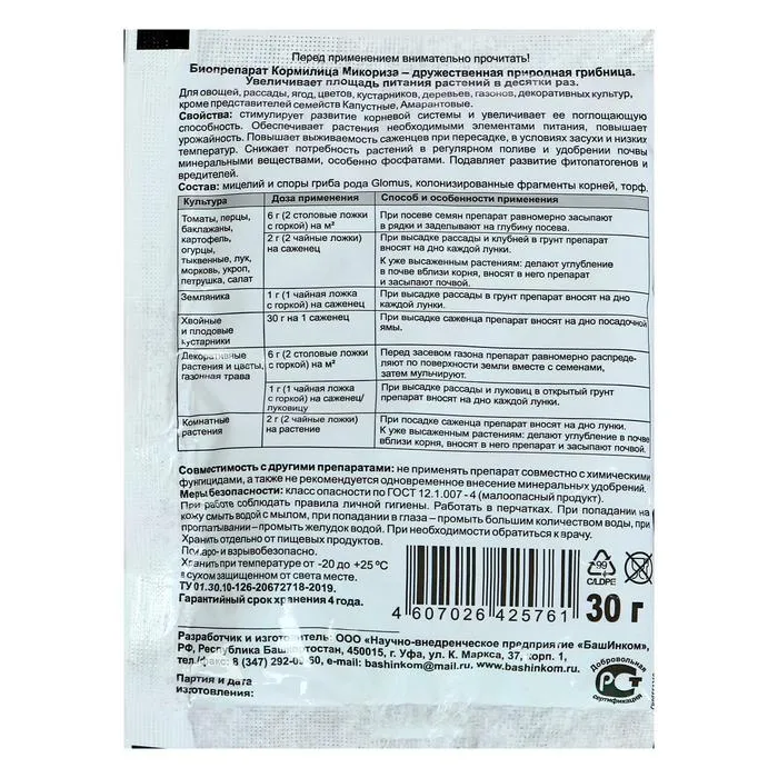В составе препарата имеются как элементы микоризного гриба, так и колонизированные им фрагменты корней, что в разы повышает его эффективность и стабильность. Микориза, развивающаяся от живого мицелия, – самая эффективная, поскольку для роста ее достаточно слегка увлажнить. Подавляет развитие фитопатогенов и вредителей. Снижает потребность растений в регулярном поливе и удобрении почвы минеральными веществами, особенно фосфатами. Повышает выживаемость саженцев при пересадке, в условиях засухи и низких температур.