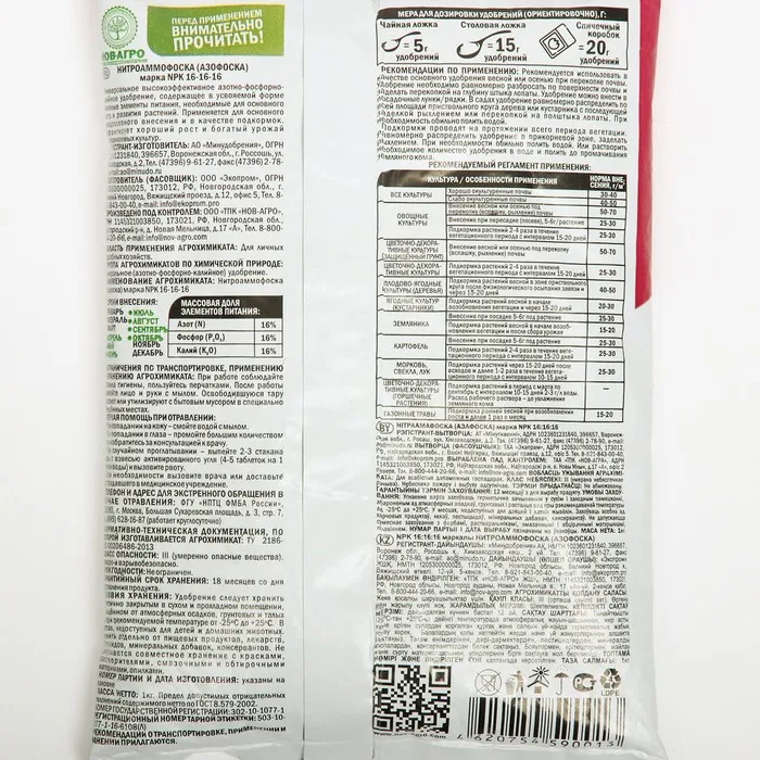 Состав: N-16%, P2O5 – 16%, K2O – 16%.