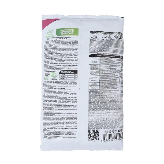 Удобрение минеральное Азофоска Нов-Агро (нитроаммофоска), 3 кг — Характеристики