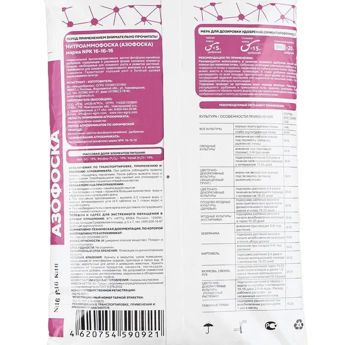 Состав: N-16%, P2O5 – 16%, K2O – 16%.