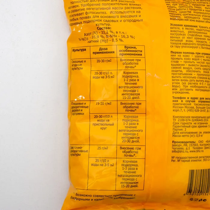 Назначение: Удобрение предназначено для развития вегетативной массы растения и усиления фотосинтеза. Используется на любых почвах для основного внесения и корневых подкормок садовых и огородных культур.