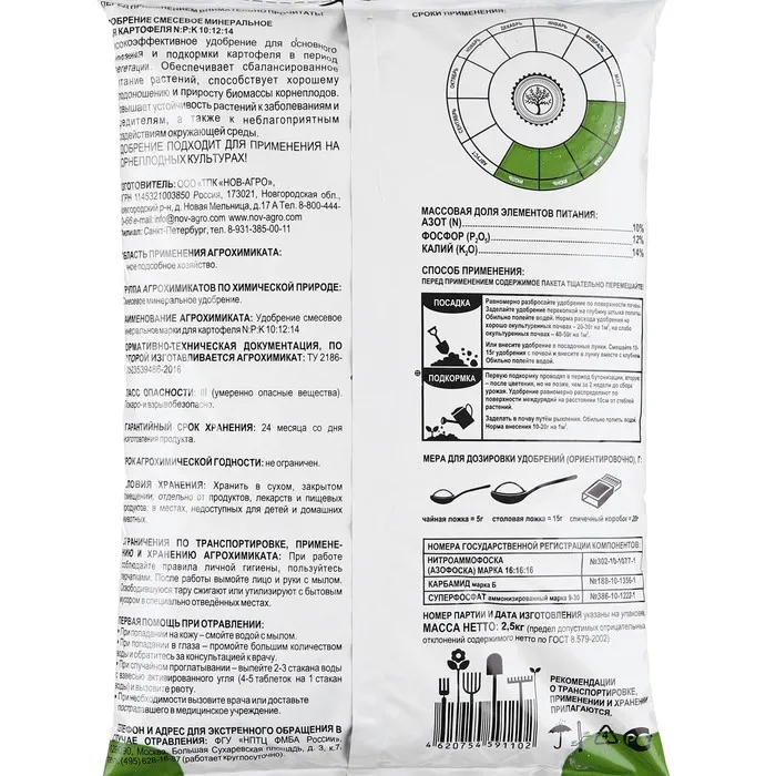 Смесевое минеральное,высокоэффективное для основного внесения и подкормки картофеля в период вегетации .Обеспечивает питание растений , способствует хорошему плодоношению и приросту биомассы корнеплодов. Повышает устойчивость растений к заболеваниям и вредителям , а также к неблагоприятным воздействиям окружающей среды. Массовая доля питательных веществ : азот -10%,фосфор - 12%,калий -14%.