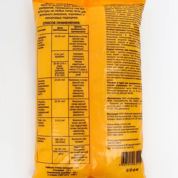 Применяется при перекопке почвы весной,а также для корневых и некорневых подкормок в течение вегетации растений.