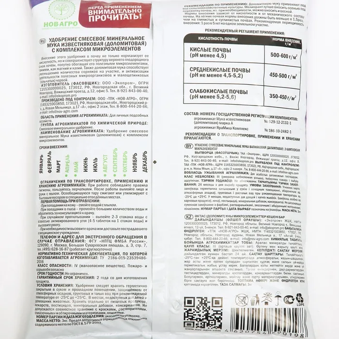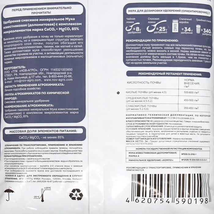 Удобрение минеральное "Классика дачника", мука известняковая, доломитовая, 3 кг — Характеристики