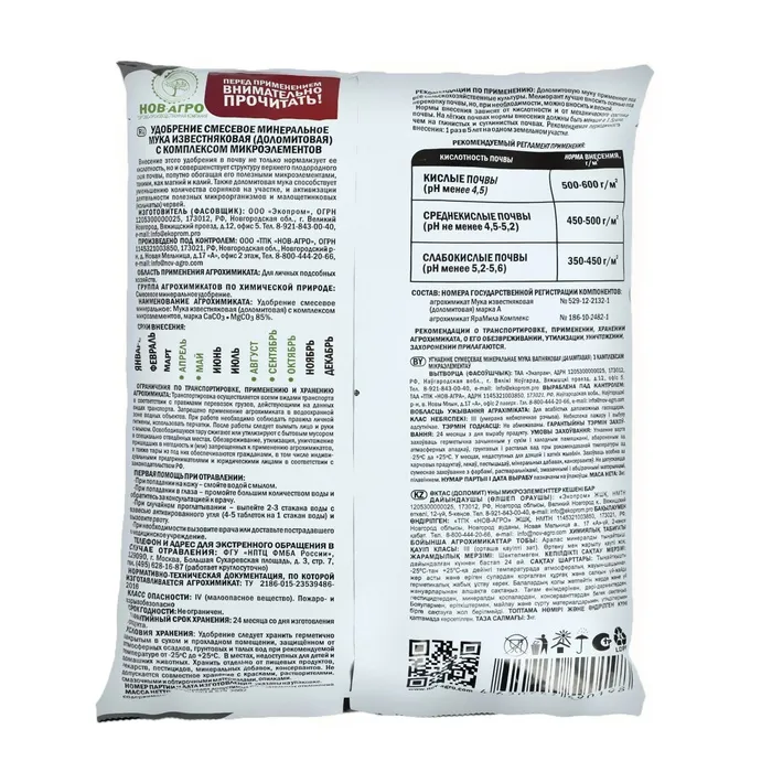 Известняковая (Доломитовая) мука —предназначена для известкования кислых почв, обогащения ее кальцием и магнием. Почва после добавления муки становится более рыхлой, усиливается жизнедеятельность полезных для возделывания культур микроорганизмов, повышается эффективность вносимых удобрений.