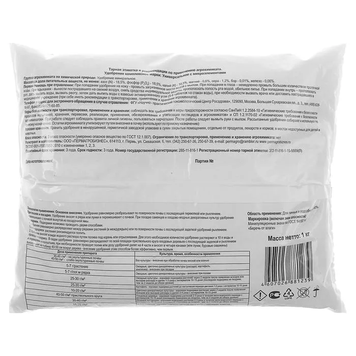 Удобрение минеральное "Пермагробизнес", универсальное с микроэлементами, 1 кг.Удобрение "Пермагробизнес" представляет собой универсальное минеральное удобрение с добавлением микроэлементов, предназначенное для основного внесения и подкормок овощных, плодово-ягодных и цветочных культур. Благодаря сбалансированному содержанию питательных веществ, данное удобрение способствует улучшению плодородия почвы, стимулирует рост и развитие растений, а также повышает их устойчивость к болезням и вредителям.Состав удобрения "Пермагробизнес" включает в себя следующие микроэлементы:- Азот (N) – 18%. Азот является одним из основных элементов, необходимых для жизнедеятельности растений. Он способствует образованию белков, ферментов и других важных органических соединений, необходимых для роста и развития растений.- Фосфор (P) – 18%. Фосфор играет важную роль в процессах фотосинтеза, а также является неотъемлемым компонентом клеточных структур растений. Он способствует образованию корней, цветения и плодоношения.- Калий (K) – 18%. Калий необходим для поддержания водного баланса растений, улучшения их устойчивости к стрессовым условиям, а также для образования фруктов и семян.- Магний (Mg) – 0,6%. Магний является ключевым элементом в процессе фотосинтеза, способствует активации ферментов и обмену веществ в растениях.- Сера (S) – 1,2%. Сера играет важную роль в образовании аминокислот, белков и витаминов в растениях, а также способствует улучшению качества почвы.- Бор (B) – 0,01%. Бор необходим для образования клеточных стенок, регуляции обмена веществ и транспорта сахаров в растениях.- Железо (Fe) – 0,06%. Железо является важным компонентом для образования хлорофилла, который необходим для процесса фотосинтеза.Удобрение "Пермагробизнес" рекомендуется использовать уже сегодня для достижения максимальных результатов при выращивании овощей, фруктов, ягод и цветов. Регулярное применение данного удобрения способствует увеличению урожайности, улучшению качества плодов и повышению устойчивости растений к неблагоприятным условиям.