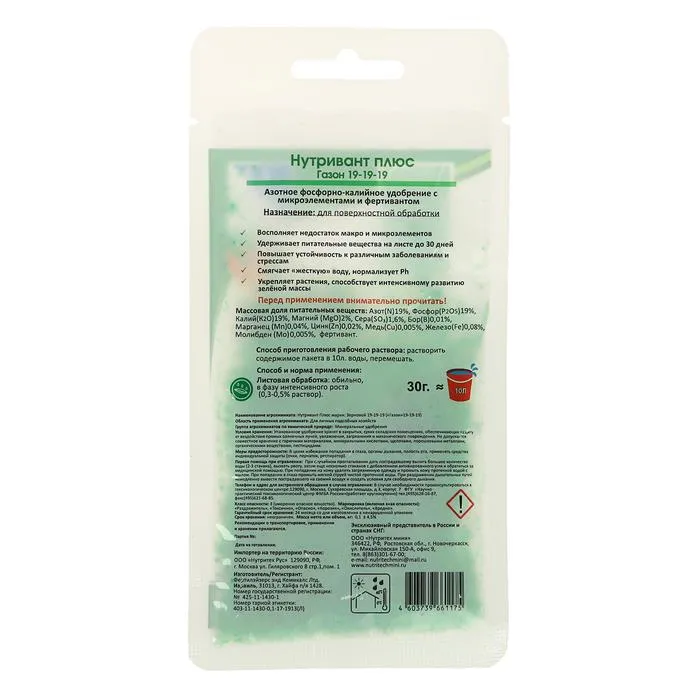 Удобрение Нутривант Плюс Газон 19-19-19, 30 г — Характеристики