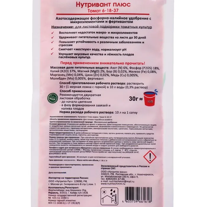 Удобрение «Нутривант Плюс» Томат 6-18-37, профессиональное, 30 г — Характеристики