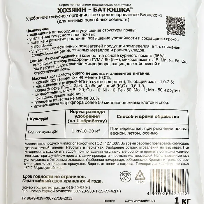 Природный гумусный препарат длительного (пролонгированного) действия. Для мощного повышения плодородия почвы и урожайности, увеличения гумусного слоя, улучшения структуры почвы, повышения эффективности питания растений, снижение нитратов и нейтрализации тяжелых металлов и др. вредных веществ, оздоровления почвы, активизации полезной почвенной микрофлоры и ликвидации усталости почвы.