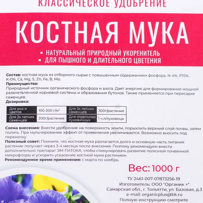 Костная мука Органик+ - это удобрение, которое производится из костей животных и содержит множество полезных элементов для растений. Это органическое удобрение является экологически чистым и не содержит вредных химических добавок.