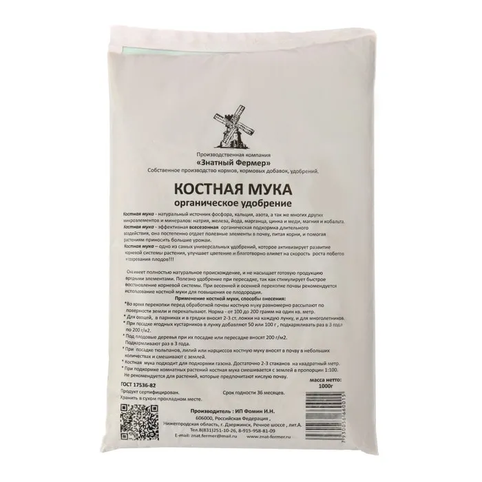 Костная мука – одно из самых универсальных удобрений, которое благотворно влияет практически на все полевые, садовые и огородные культуры. Она имеет полностью натуральное происхождение, и не насыщает готовую продукцию вредными элементами. Костная мука прекрасно нейтрализует кислотность почвы. Еще один плюс от внесения муки из костей – она разлагается в течении 5-8 месяцев, что делает ее удобрением с пролонгированным сроком действия, которое постепенно отдает полезные элементы в почву, питая корни, и помогая растениям приносить большие урожаи!!!
