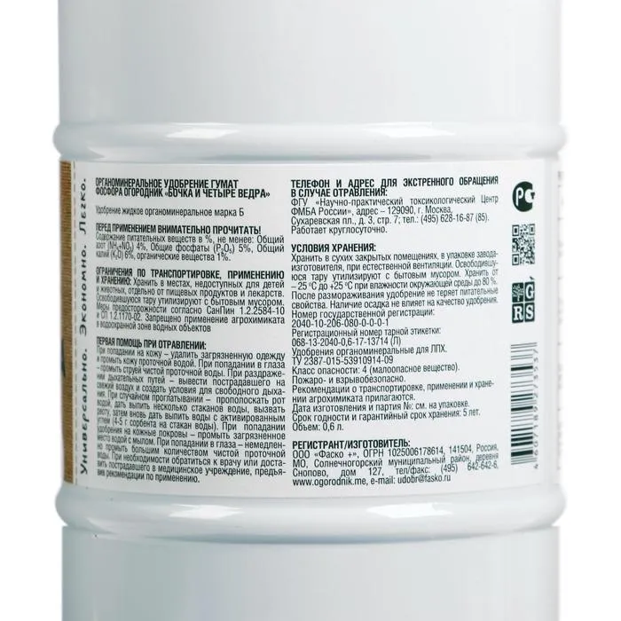 Удобрение органическое жидкое Бочка и четыре ведра, гумат Фосфора в бутылках, 600 мл — Характеристики