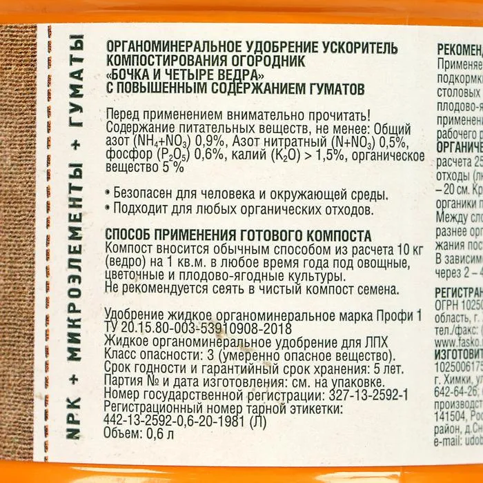 Удобрение органоминеральное "Огородник" является эффективным ускорителем компостирования, который способствует повышению плодородия почвы и улучшению урожайности. Продукт представляет собой жидкое удобрение, упакованное в удобную бочку объемом 600 мл, снабженную 4 ведрами для удобного дозирования.