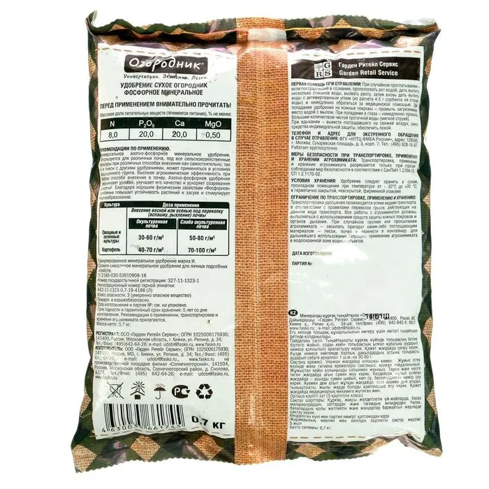 Применение: овощные, зеленные культуры (окультуренная почва) - 30-60 г/м2 - Внесение весной или осенью под перекопку (вспашку, рыхление) почвы. Овощные, зеленные культуры (неокультуренная почва) - 50-80 г/м2 - Внесение весной или осенью под перекопку (вспашку, рыхление) почвы. Картофель (окультуренная почва) - 40-70 г/м2 - Внесение осенью под перекопку (вспашку, рыхление) почвы. Картофель (неокультуренная почва) - 70-100 г/м2 - Внесение осенью под перекопку (вспашку, рыхление) почвы.