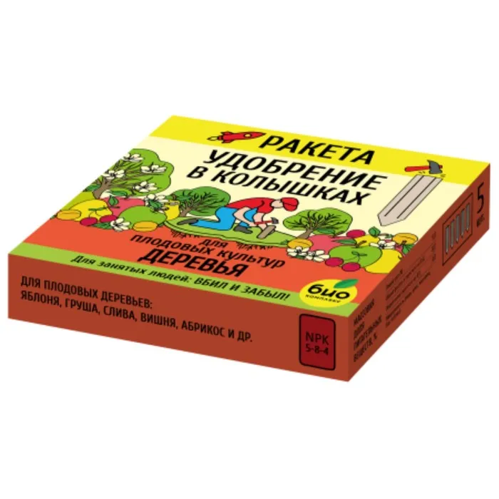 Способ применения: вбить необходимое количество колышек-удобрений в увлажненную землю на всю площадь приствольного круга, используя деревянный молоток, в соответствии с рекомендуемыми дозами (согласно таблице на упаковке).