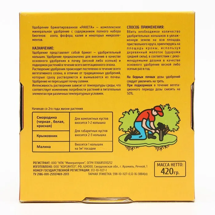 Процесс действия: растворение удобрений-колышек «Ракета» происходит постепенно в течение всего вегетативного сезона, в отличие от традиционных удобрений, которые сразу растворяются и вымываются из почвы. Не требует подготовки почвы (перекопки, взрыхления). Удобно.