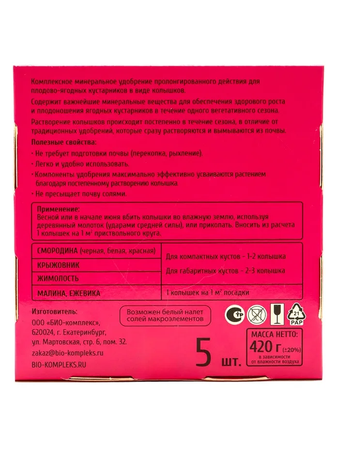 Твердые брикеты – колья. Применяется в качестве основного минерального удобрения для плодово-ягодных кустарников весной либо осенью.