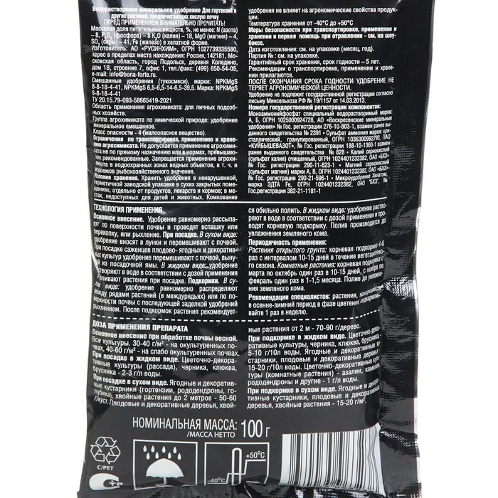 Массовая доля питательных веществ, %: Азот – 8, Фосфор – 8, Калий – 18, Магний – 4, Сера – 41, Железо в хелатной форме