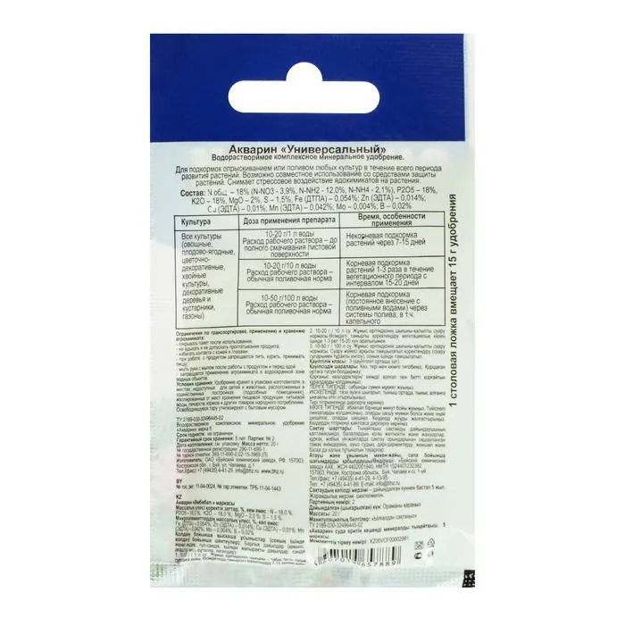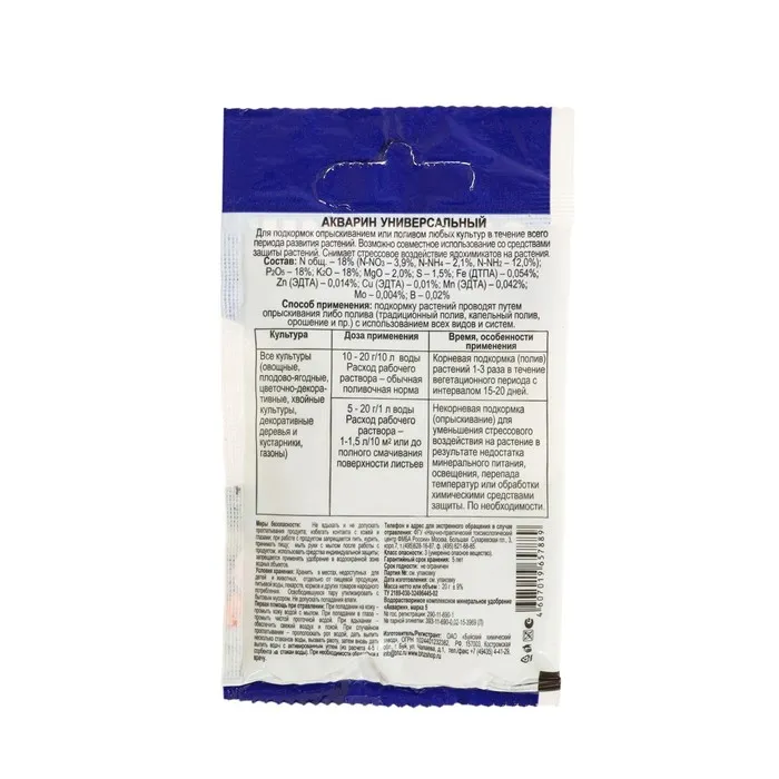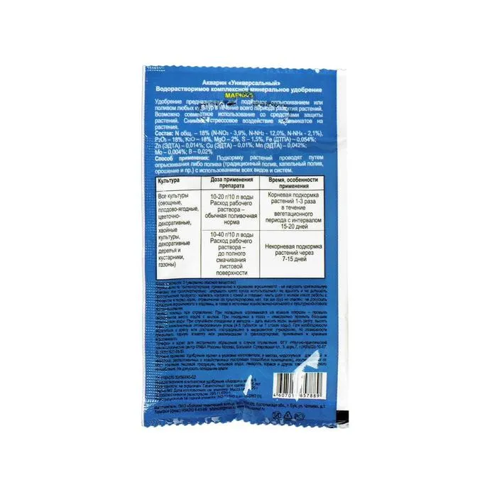 Удобрение водорастворимое минеральное "Акварин" универсальный, 20 г — Характеристики