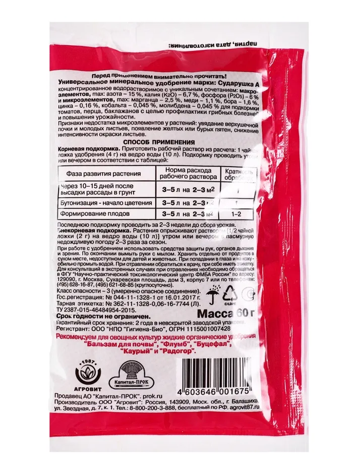 Удобрение водорастворимое минеральное "Сударушка А", томат, 60 г — Характеристики