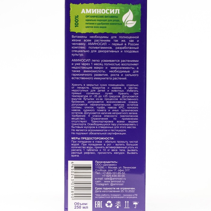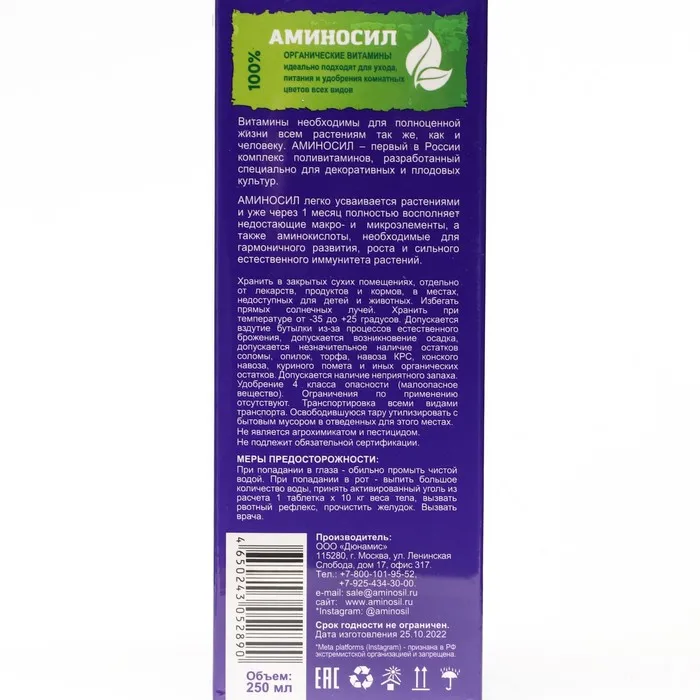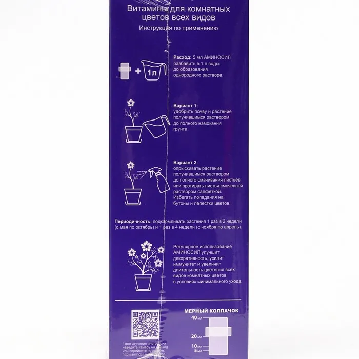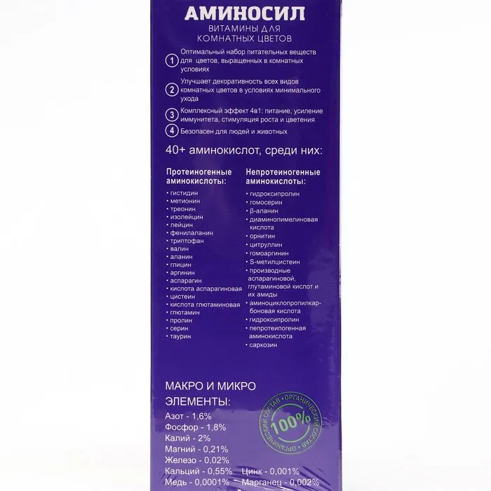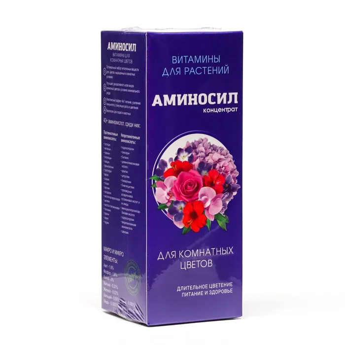 Витамины Аминосил для комнатных цветов это специально разработанный комплексный продукт, который способен обеспечить все необходимые элементы питания для здорового и красивого роста самых разных комнатных растений. Удобрение содержит все важные макро и микроэлементы, которые способны улучшить здоровье и красоту, а также ингредиенты, которые способствуют более интенсивному и длительному цветению. Поможет укрепить корневую систему и улучшить общее состояние растений. Макро и микроэлементы. 40+ аминокислот. Рекомендуется использовать в течение всего периода роста и цветения. Это позволяет достичь максимального результата и обеспечить вашим комнатным растениям все необходимые элементы питания. Если вы хотите обеспечить здоровый и красивый рост своих растений, то удобрение для комнатных цветов - это идеальный выбор для вас. Оно подходит для ухода за самыми разными растениями и поможет создать прекрасный оазис красоты и здоровья в вашем доме. Жидкая подкормка для домашних балконных комнатных цветов (чайная бенгальская полиантовая роза, фиалки орхидеи бегонии).5 мл витаминного концентрата Аминосил разбавить в 1 л воды до образования однородного раствора.Вариант 1: поливать почву и растение получившимся раствором ближе к основанию до полного намокания грунта.Вариант 2: опрыскивать растение получившимся раствором до полного смачивания листьев или протирать листья смоченной раствором салфеткой. Избегать попадания на бутоны и лепестки цветов.Периодичность: подкармливайте растения 1 раз в 2 недели (с мая по октябрь) и 1 раз в 4 недели (с ноября по апрель).Оптимальный набор питательных веществ для всех цветов, выращенных в комнатных условиях;Улучшает декоративность* всех видов комнатных цветов в условиях минимального ухода;Комплексный эффект 4 в1: питание, усиление иммунитета, стимуляция роста и цветения;