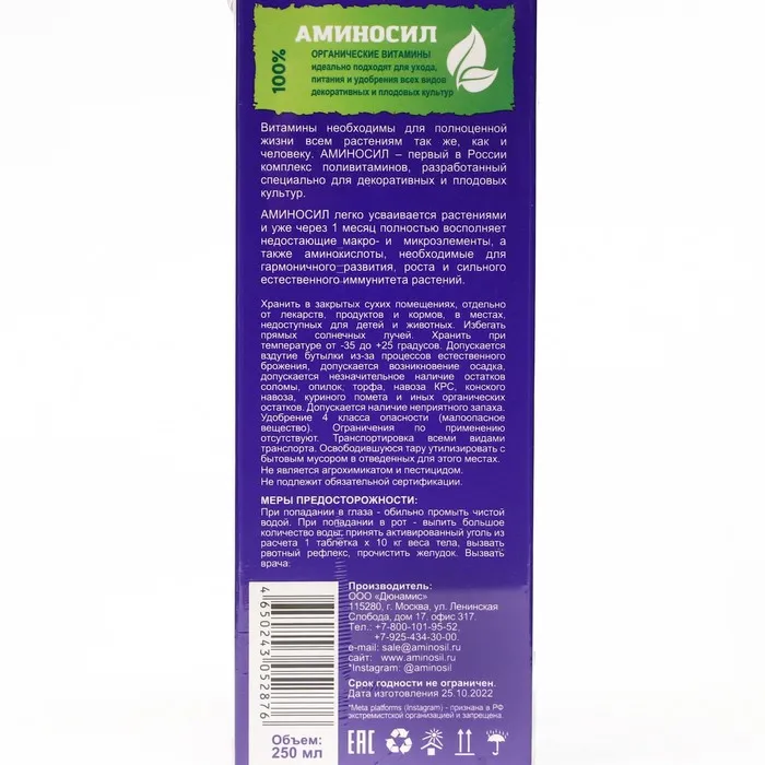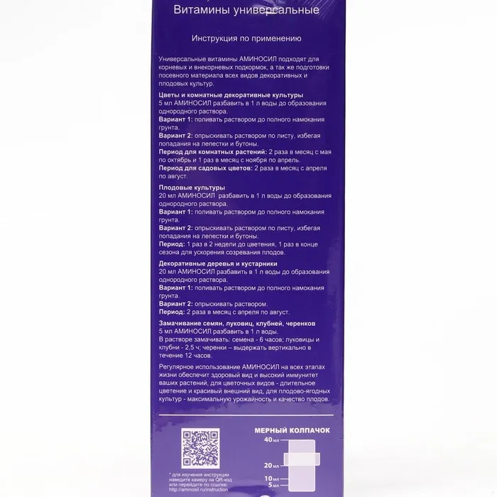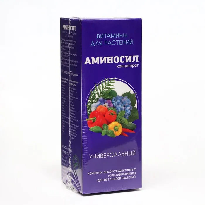 Витамины Аминосил для растений содержит комплекс из питательных веществ, макро и микроэлементов, которые снабжают растения всем необходимым для хорошего здоровья и роста. Он обеспечивает их эффективной подкормкой на огороде и дома, благодаря чему увеличивается урожайность и качество плодов. Может использоваться в любое время года, в любом количестве и с любым типом воды. Способствует росту и развитию корневой системы, повышает устойчивость к заболеваниям и стрессам, улучшает качество урожая, позволяет увеличить урожайность.20 мл АМИНОСИЛ разбавить в 1 л воды до образования однородного раствора.Вариант 1: поливать раствором до полного намокания грунта.Вариант 2: опрыскивать раствором по листу, избегая попадания на лепестки и бутоны.Период: 1 раз в 2 недели до цветения, 1 раз в конце сезона для ускорения созревания плодов.Декоративные деревья и кустарники:20 мл АМИНОСИЛ разбавить в 1 л воды до образования однородного раствора.Вариант 1: поливать раствором до полного намокания грунта.Вариант 2: опрыскивать раствором.Период: 2 раза в месяц с апреля по август.Замачивание семян, луковиц, клубней, черенков:5 мл “Аминосил” разбавить в 1 л воды.В получившемся растворе замачивать:Семена - в течении 6 часовЛуковицы и клубни - в течении 2,5 часаЧеренки - выдерживать вертикально в течении 12 часов.Насыщает растение, субстрат и почву всеми необходимыми витаминами;Укрепляет здоровье и иммунитет растения;Обеспечивает максимальную урожайность;Восстанавливает и улучшает декоративность растений;Улучшает защитные свойства в периоды засухи и заморозков.