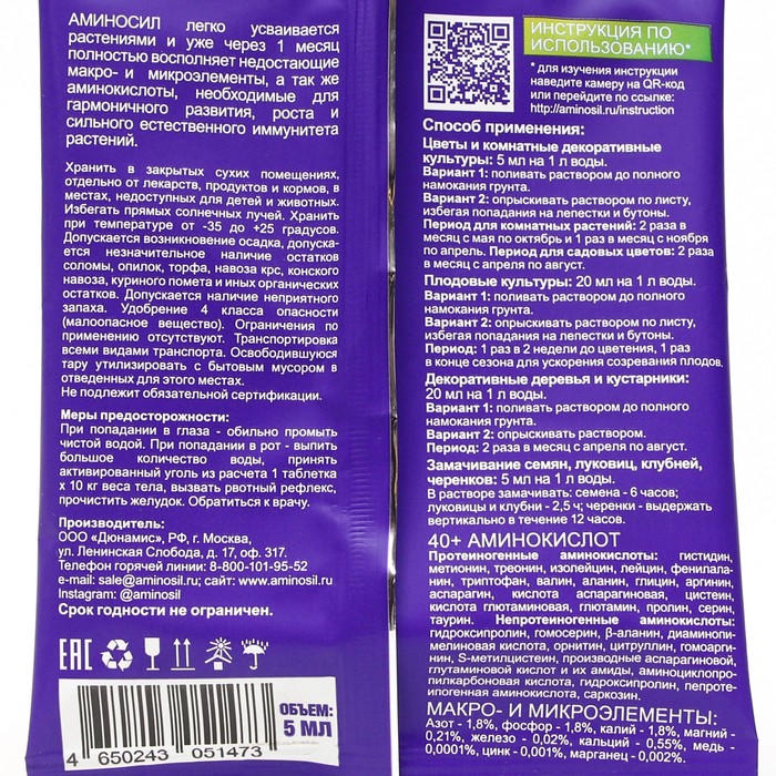 Удобрение жидкое Аминосил Универсальный, 5 мл — Характеристики