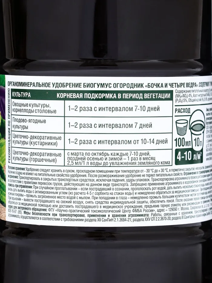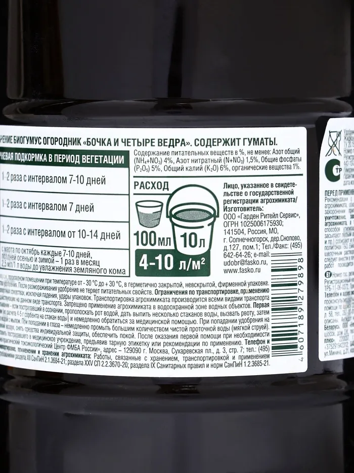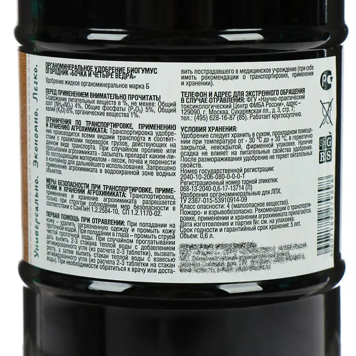 Удобрение жидкое Огородник Бочка и четыре ведра Биогумус органоминеральное 0,6л — Характеристики