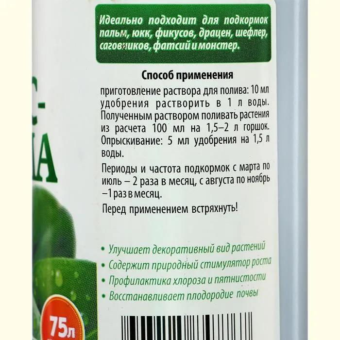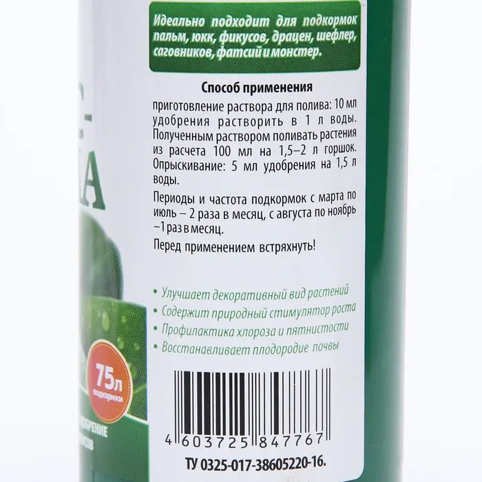 Идеально подходит для подкормок пальм, юкк, фикусов, драцен, шефлер, саговников, фатсий и монстер. Улучшает декоративный вид растений. Содержит природный стимулятор роста. Профилактика хлороза и пятнистости. Восстанавливает плодородие почвы.