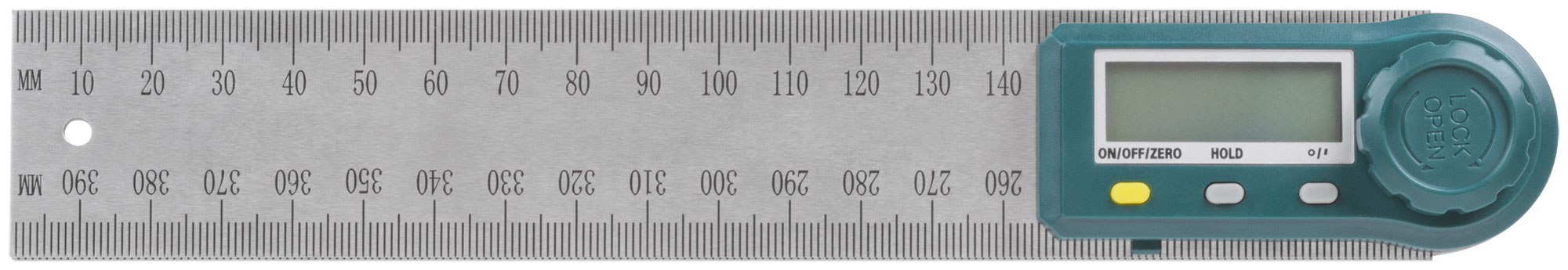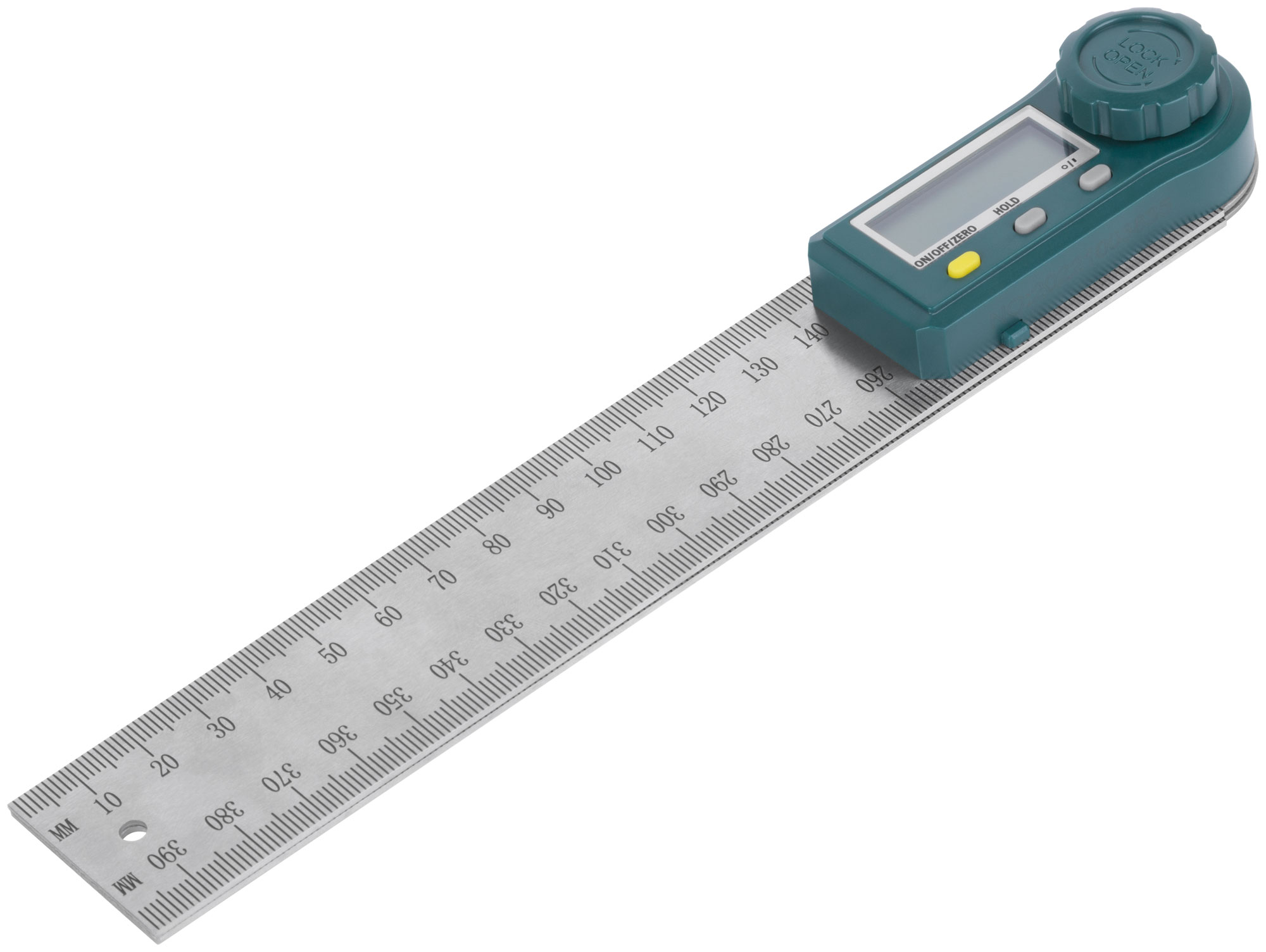 Линейка выполнена из нержавеющей стали, что обеспечивает долговечность и устойчивость к коррозии. Корпус электронного блока и фиксатор изготовлены из прочного пластика. Устройство имеет двустороннюю рифленую метрическую шкалу, которая раскладывается до 400 мм.