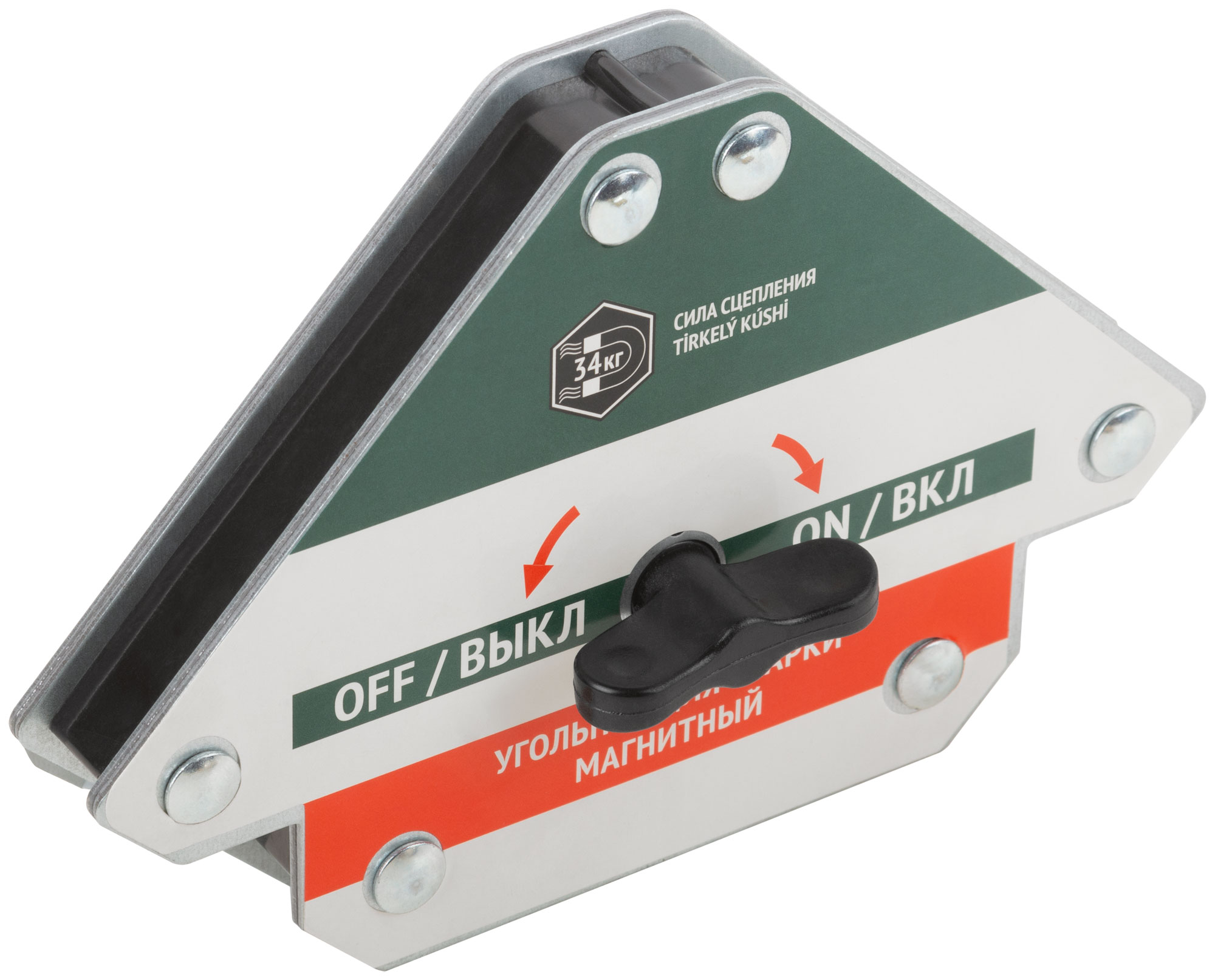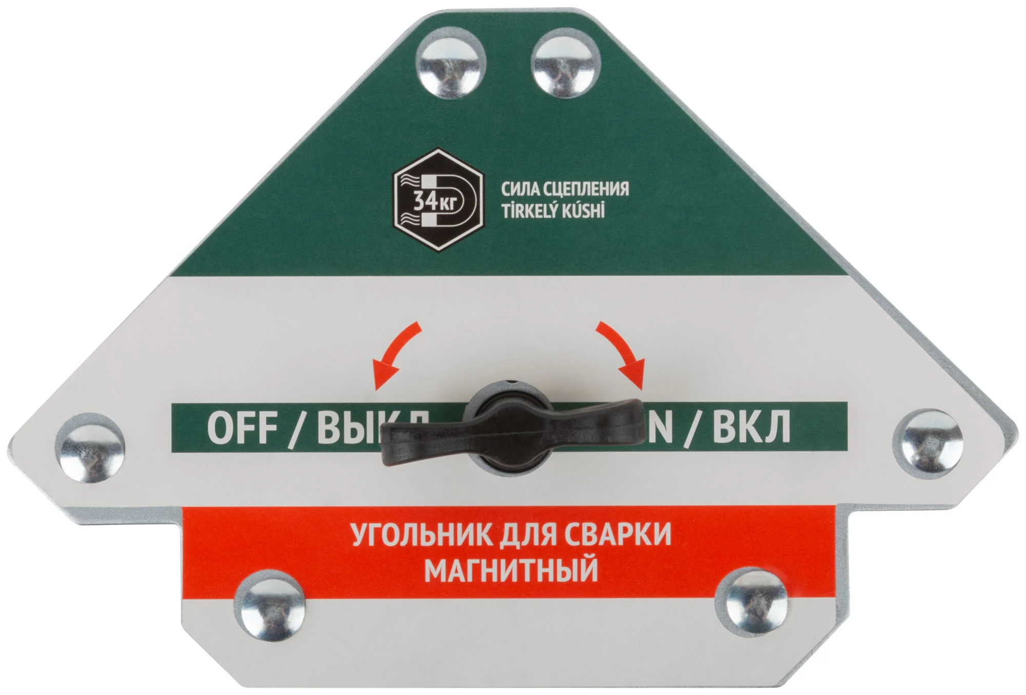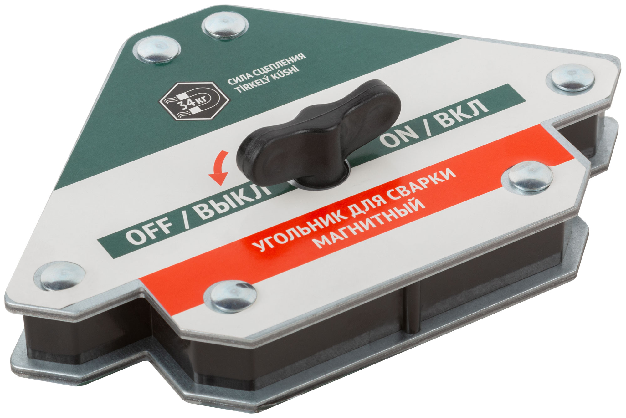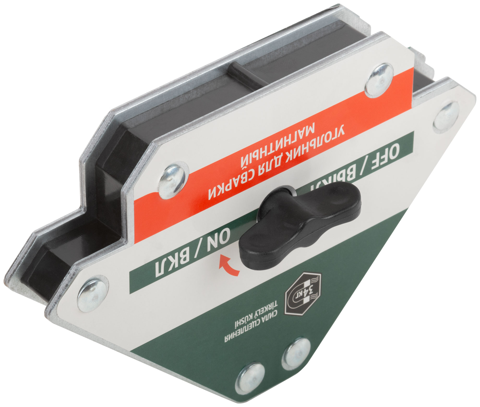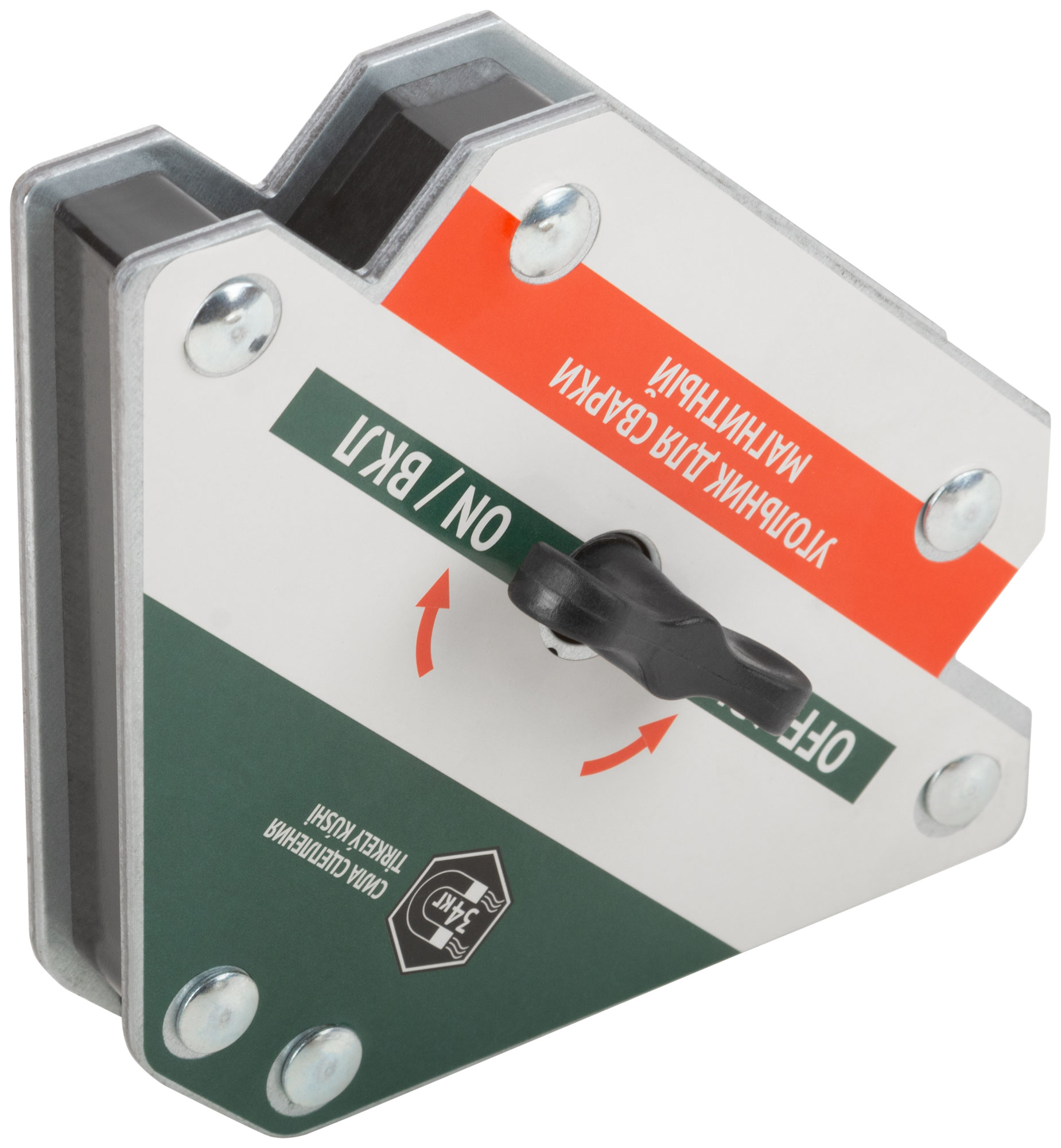 Угольник выполнен из термообработанной инструментальной стали и оснащен ферритовым магнитом, который можно отключать с помощью пластикового переключателя на корпусе. Это позволяет безопасно устанавливать и снимать угольник, не опасаясь повреждений или случайного сдвига.