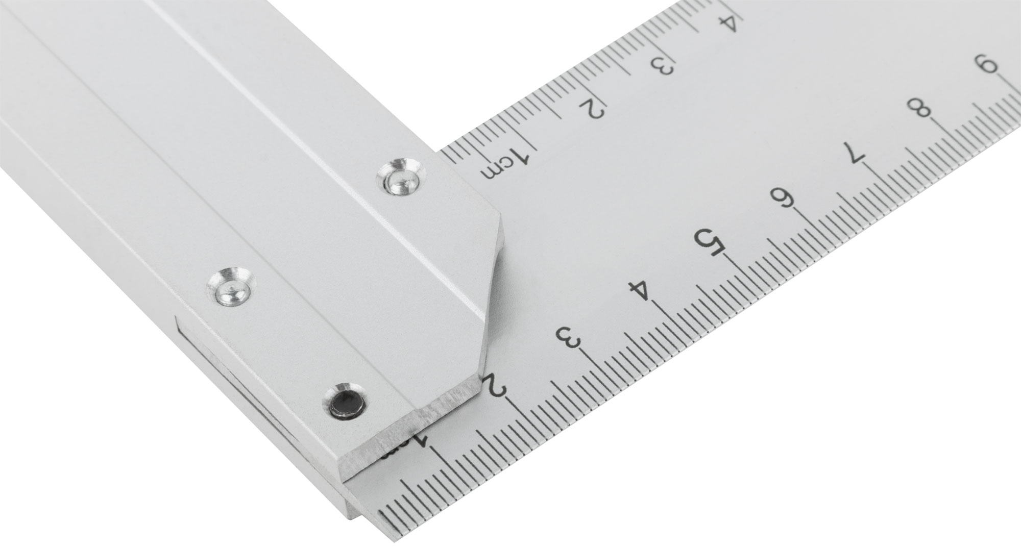 Конструкция из литого алюминия обеспечивает легкость и долговечность инструмента. Двусторонняя рифленая шкала позволяет удобно снимать замеры с обеих сторон, что особенно полезно при работе с крупногабаритными материалами.
