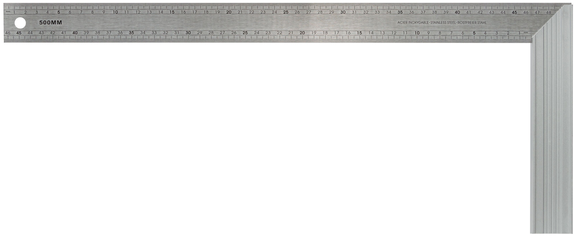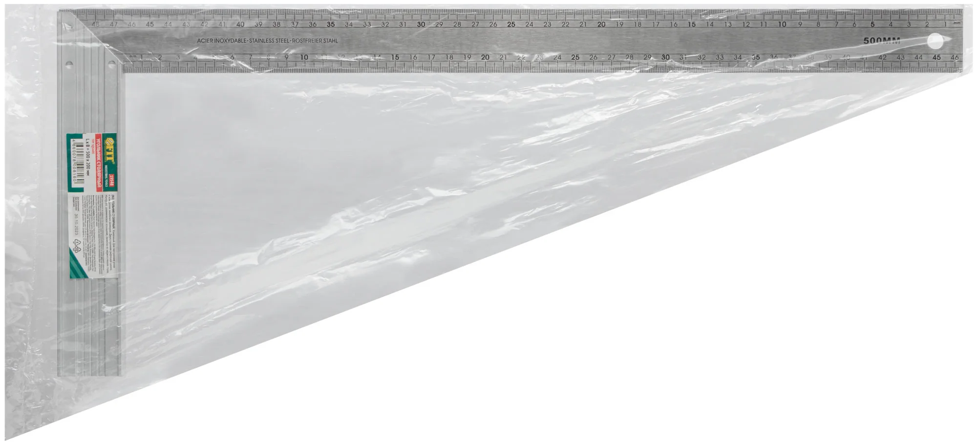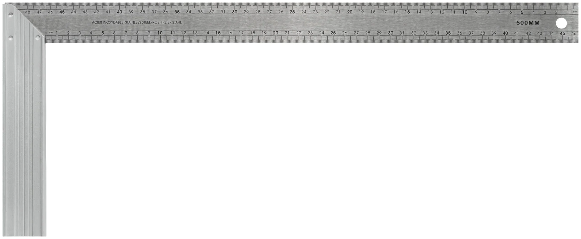 Угольник изготовлен с алюминиевым основанием и линейкой из нержавеющей стали, что обеспечивает прочность и долговечность. Двусторонняя рифленая шкала позволяет точно измерять и размечать углы, делая процесс работы быстрым и эффективным.