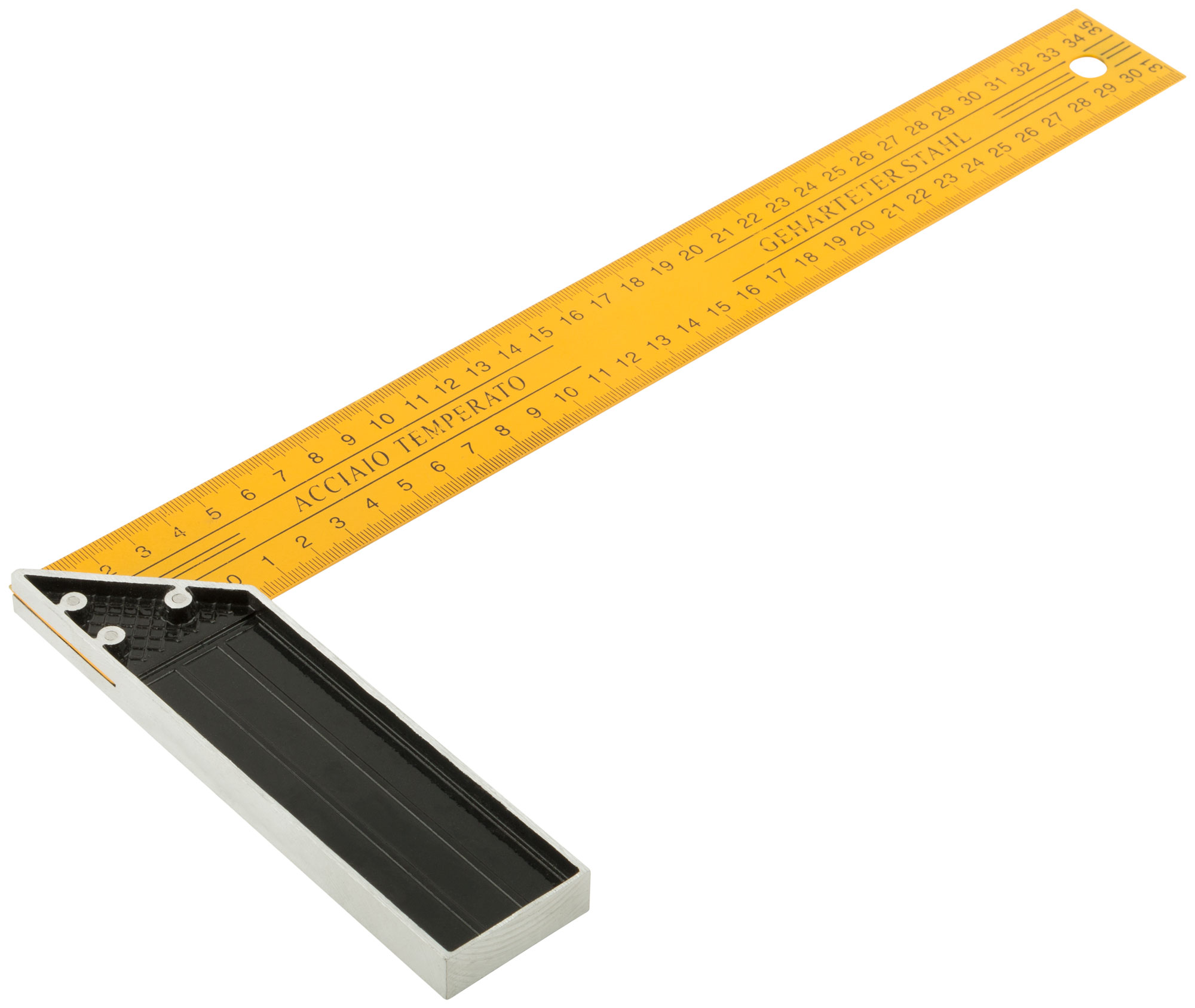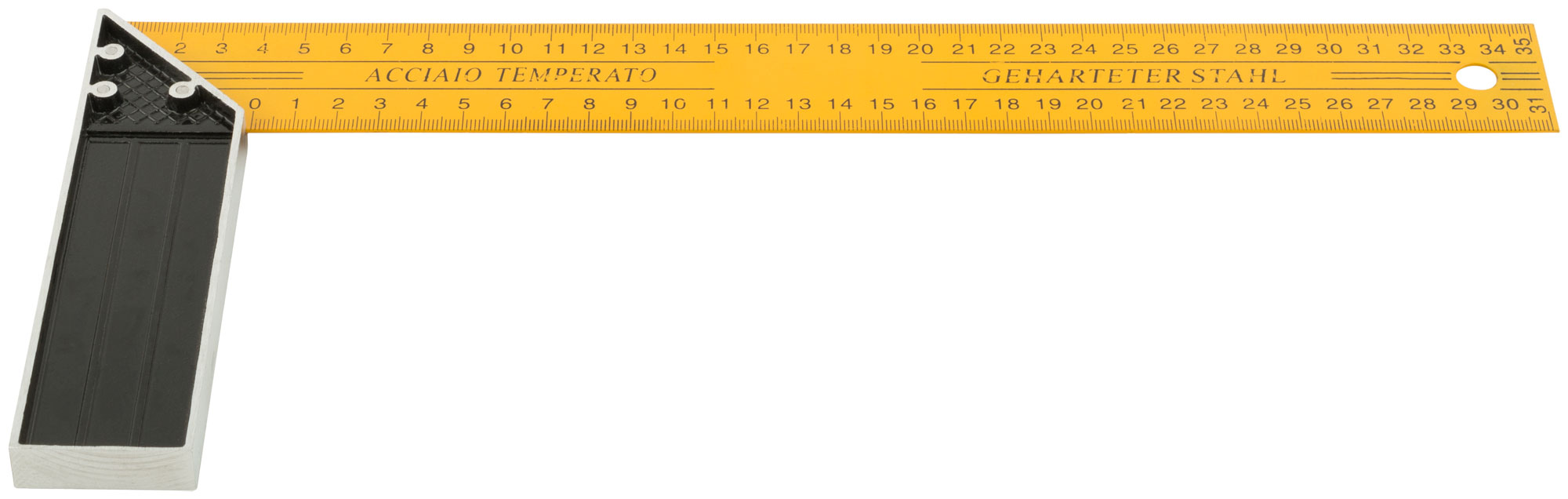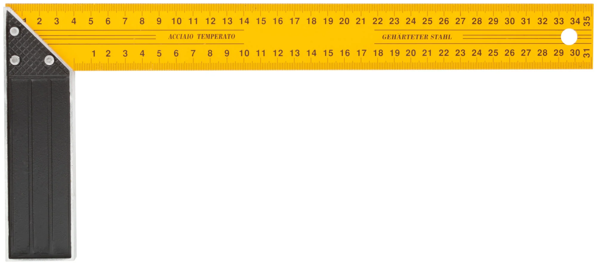 Угольник оснащен двусторонней крашеной шкалой, что обеспечивает удобство при работе с обеих сторон изделия. Его основа выполнена из алюминия, а линейка — из инструментальной стали, что гарантирует долговечность и устойчивость к повреждениям.