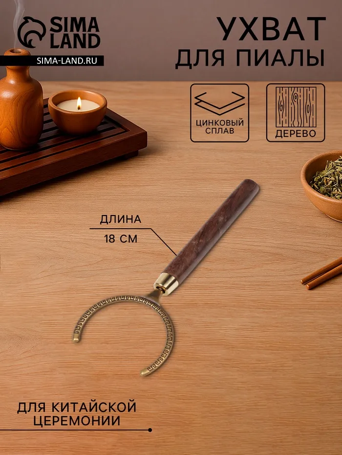 Изящный ухват для пиалы, сочетающий в себе прочность цинкового сплава и тепло натурального дерева. Предназначен для безопасного и удобного обращения с горячими пиалами во время чайной церемонии. Длина: 18 см.