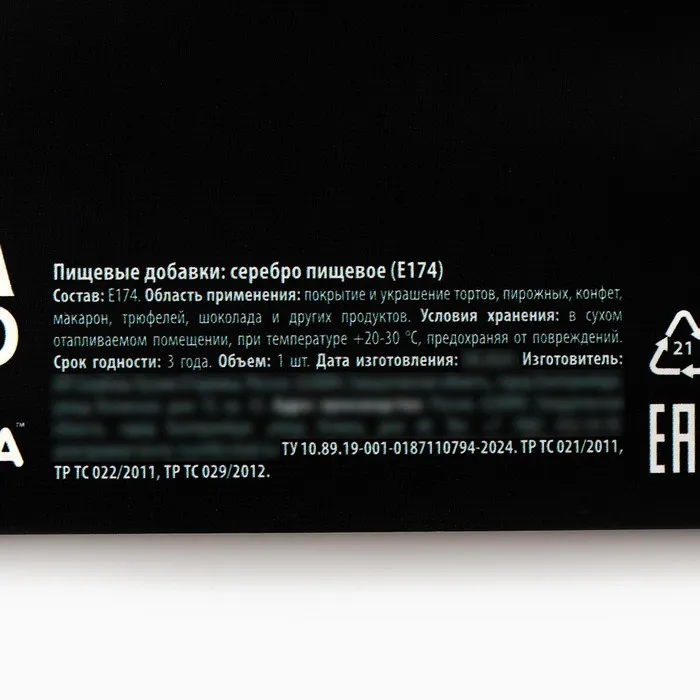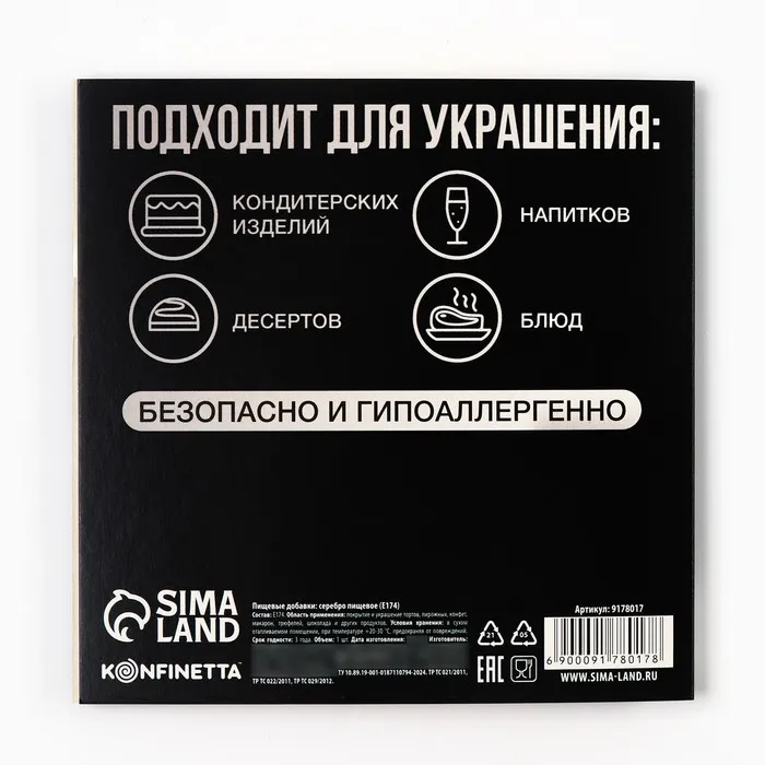 Украшение для торта серебро пищевое в листе, 1 шт. — Характеристики