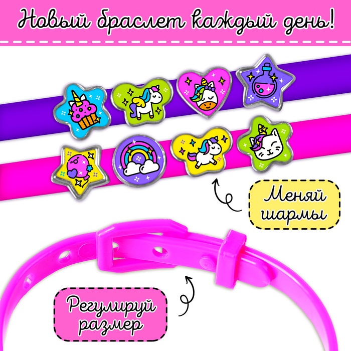С этим набором малышка создаст целых 3 уникальных браслета с шармиками, которые подойдут к любому образу.