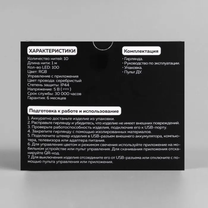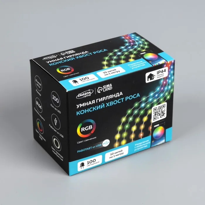 Умная гирлянда «Конский хвост» 10 нитей по 1 м роса, IP20, серебристая нить, 100 LED, пульт ДУ, приложение, свечение RGB, USB — Характеристики